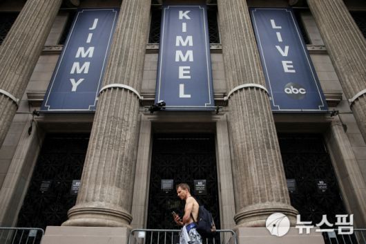 2025년 9월 17일, 미국 캘리포니아주 로스앤젤레스 할리우드 대로에 위치한 엘 캐피탄 엔터테인먼트 센터(El Capitan Entertainment Centre) 앞을 한 사람이 지나가고 있습니다. 이곳은 '지미 키멀 라이브(Jimmy Kimmel Live!)'가 방송 녹화를 위해 사용되는 곳이다.[사진=로이터 뉴스핌] |