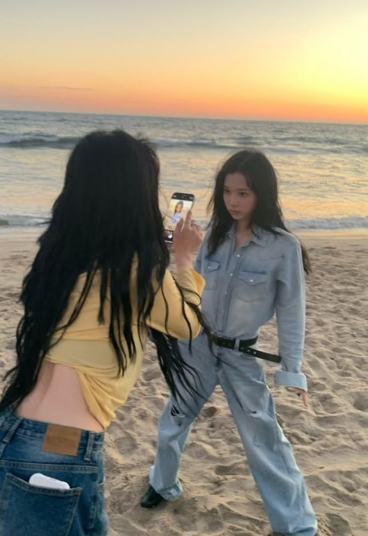 두 사람은 바닷가를 배경으로 서로를 찍어주는가 하면, 카리나가 윈터를 업거나 활짝 웃음을 터트리는 모습으로 훈훈함을 자아냈다.