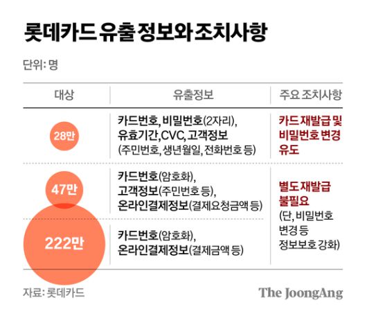 유출된 정보엔 296만9000명의 개인 신용정보가 포함됐다. 전체 롯데카드 개인 고객(964만5000명)의 약 30%에 해당한다. 이 가운데 유출된 정보로 카드 부정 사용이 발생할 가능성이 있는 고객은 28만 명으로 추려졌다. 지난 7월 22일부터 8월 27일까지 네이버페이·삼성페이 등 간편결제 서비스나 온라인 쇼핑몰에 카드 정보를 신규 등록한 이용자다. 해킹 공격으로 이들의 카드 번호, 비밀번호(2자리)와 CVC 번호는 물론 주민등록번호, 생년월일 등의 개인정보가 빠져나갔다.