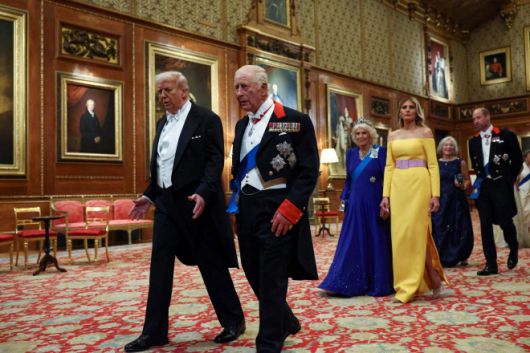 도널드 트럼프 미국 대통령이 외국 정상 최초로 재임 중 2번째 영국 왕실의 국빈 만찬에 초대를 받아 극진한 대접을 받았다. 트럼프 대통령이 17일(현지시간) 부인 멜라니아 여사와 함께 영국 윈저성에 도착하자 척탄병 근위대, 콜드스트림 근위대, 스코틀랜드 근위대 등 세 가지 색을 상징하는 의장대의 환영을 받았다. 영국에서 국빈 방문을 위해 세 가지 색상의 의장대가 모인 적은 이번이 처음이다. 의장대 사열엔 영국군 1300명과 말 120필이 동원됐다. 찰스 3세 영국 국왕은 트럼프 대통령이 의장대 사열 중 앞서 걷도록 배려했다.