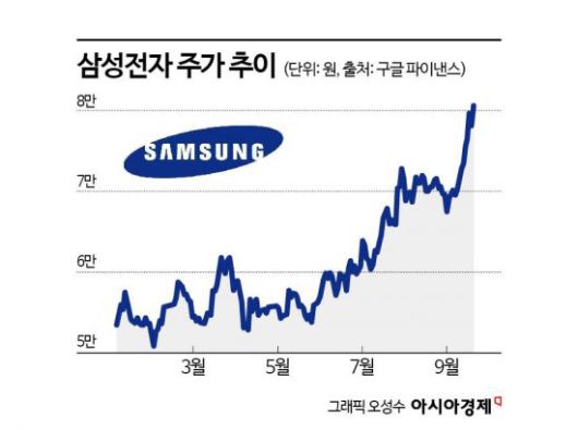 19일 한국거래소에 따르면 삼성전자는 전날 2.94% 오른 8만500원에 거래를 마치며 연중 최고가를 새로 썼다. 삼성전자 주가가 8만원을 웃돈 것은 지난해 8월19일 이후 13개월 만이다. 이날 삼성전자와 나란히 신고가를 경신한 SK하이닉스는 장중 7% 넘게 뛰며 역대 최고가(35만7000원)를 찍기도 했다.