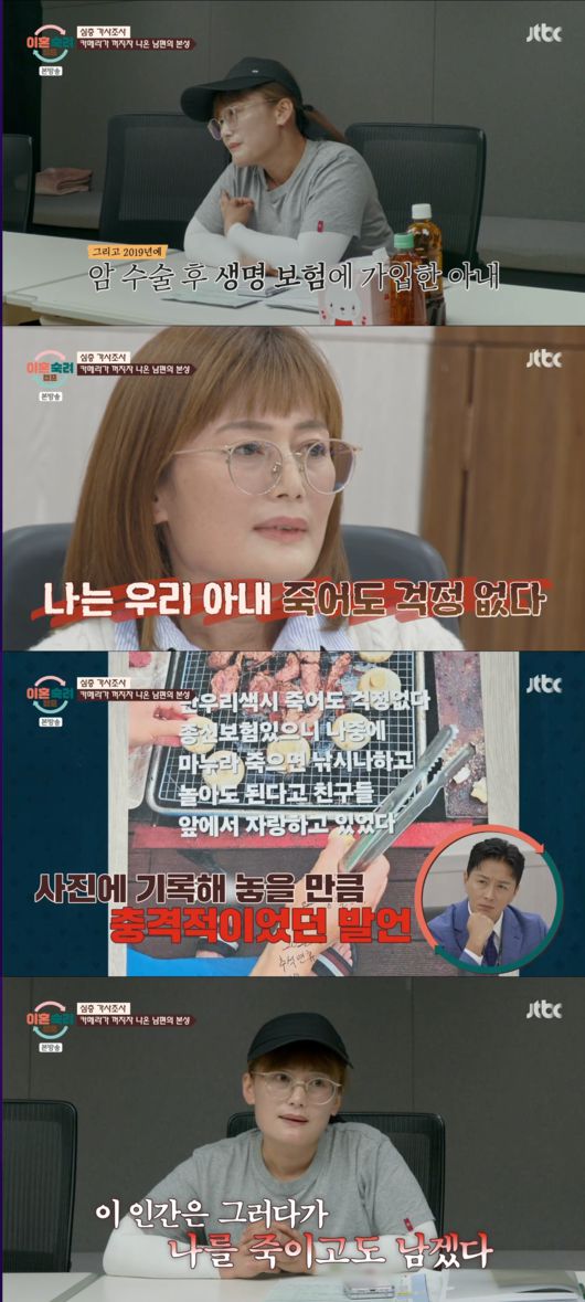 더욱 충격적인 일은 아내가 암 수술을 받은 후 발생했다. 아내는 남편과이여행을 가서 ““나는 우리 아내 죽어도 걱정 없다. 우리 아내 죽으면 보험금 찾아서 놀면서 애 키우면 된다”는 말을 했다고고 폭로했다.