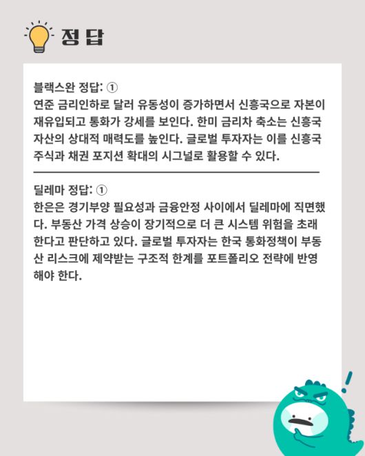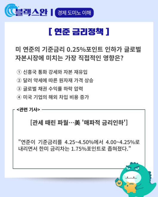 A. 연준이 기준금리를 인하했지만 파월 의장이 관세 인플레이션 우려를 언급하며 추가 인하에 신중한 입장을 보였습니다. 이에 따라 달러 강세 기조는 단기적으로 지속될 것으로 보이며, 한미 금리차 축소로 아시아 신흥국들의 통화정책 완화 여력이 확대되었습니다. 해외투자자들은 미국 자산 중심 전략을 유지하되 아시아 신흥국에 대한 선별적 투자 확대를 고려해볼 만합니다.