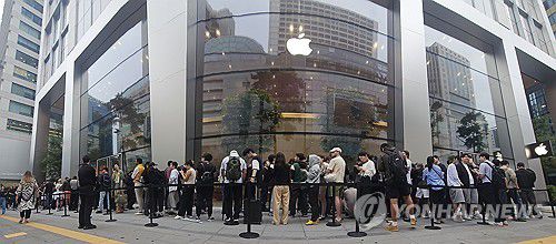 19일 오전 7시 30분께 서울 중구 명동 플래그십 스토어 애플 명동 앞에는 아이폰을 구매하려는 시민 100여명으로 북적였다.