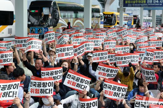(인천공항=뉴스1) 박정호 기자 = 민주노총 전국공공운수노조 인천공항지역지부와 전국공항노동조합 등 전국공항노동자연대 조합원 등이 19일 오전 인천국제공항 2터미널에서 안전한 일터·안전한 공항을 위한 전국공항노동자 총파업 대회를 진행하는 뒤로 공항버스가 도착하고 있다. 전국공항노동자연대는 연속야간노동 강제하는 교대제 개편 및 4조2교대 연내 시행, 노동시간 단축 및 인력충원, 모·자회사 불공정 계약 근절, 낙찰율 임의 적용 폐지와 인건비 환수 결원정산 폐지 등을 요구하며 이날 하루 총파업을 진행한다. 2025.9.19/뉴스1