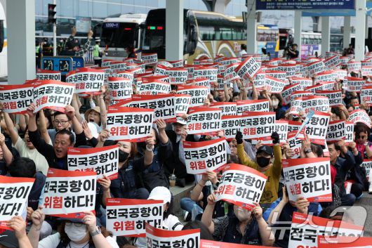 (인천공항=뉴스1) 박정호 기자 = 민주노총 전국공공운수노조 인천공항지역지부와 전국공항노동조합 등 전국공항노동자연대 조합원 등이 19일 오전 인천국제공항 2터미널에서 안전한 일터·안전한 공항을 위한 전국공항노동자 총파업 대회를 진행하는 뒤로 공항버스가 도착하고 있다. 전국공항노동자연대는 연속야간노동 강제하는 교대제 개편 및 4조2교대 연내 시행, 노동시간 단축 및 인력충원, 모·자회사 불공정 계약 근절, 낙찰율 임의 적용 폐지와 인건비 환수 결원정산 폐지 등을 요구하며 이날 하루 총파업을 진행한다. 2025.9.19/뉴스1