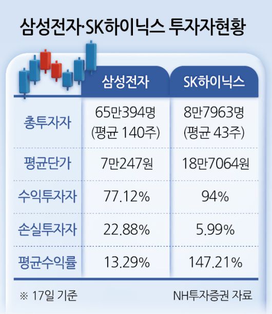 투자자 대부분은 60대 이상 연령층이다. 삼성전자는 60대 이상 투자자 비율이 37.8%로 가장 많았고 SK하이닉스도 전체 47.%를 차지했다. 50대가 각각 29.3%, 25.8%로 뒤를 이었다. 20대 이하 투자자도 각각 5.4% 3.3%로 집계됐다.