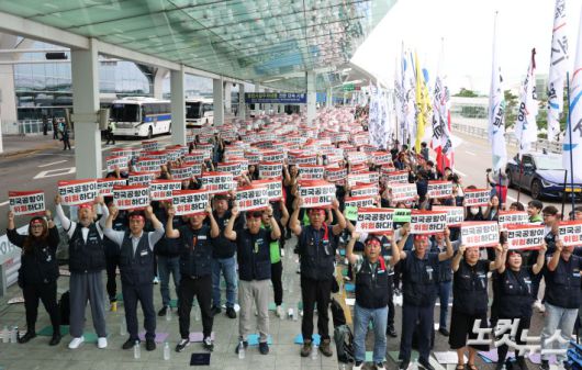 민주노총 전국공공운수노조 인천공항지역지부와 전국공항노동조합으로 구성된 전국공항노동자연대 조합원들이 19일 오전 인천국제공항 2터미널에서 열린 안전한 일터·안전한 공항을 위한 전국공항노동자 총파업 대회에서 구호를 외치고 있다.