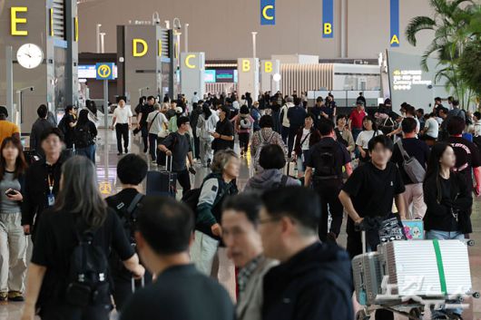인천국제공항공사와 한국공항공사 자회사에 근무하는 노동조합 소속원 1천700여명이 하루 경고 파업에 들어간 19일 오전 인천국제공항 제2여객터미널에 여행객 등이 출국장을 오가고 있다.