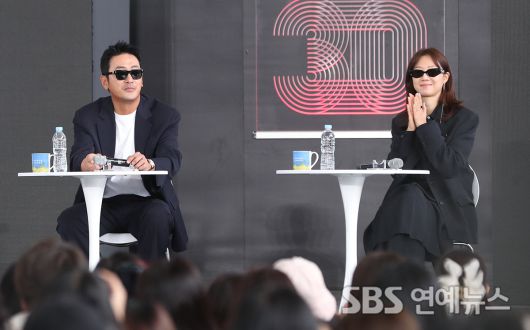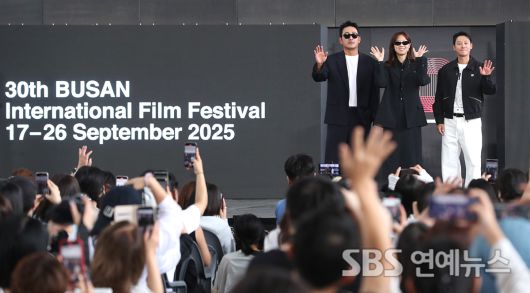 [SBS연예뉴스 | 백승철 기자] 배우 하정우(왼쪽부터), 공효진, 김동욱이 19일 오후 부산 해운대구 영화의전당에서 열린 '제30회 부산국제영화제' 영화 '윗집 사람들' 오픈토크 행사에 참석해 기념촬영을 하고 있다.