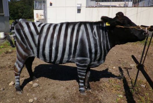 일본 연구진이 검은 소에 얼룩말과 바슷한 줄무늬를 그린 결과 모기, 쇠파리 등이 달라붙는 횟수가 절반으로 줄었다. PLOS ONE저널의 일본 연구진 연구 보고서 |