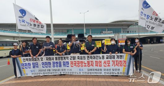 전국공항노동자연대 노동자들이 19일 김해공항 국내선청사에서 총파업 대회를 갖고 있다.2025.9.19/ⓒ News1 김태형 기자 |