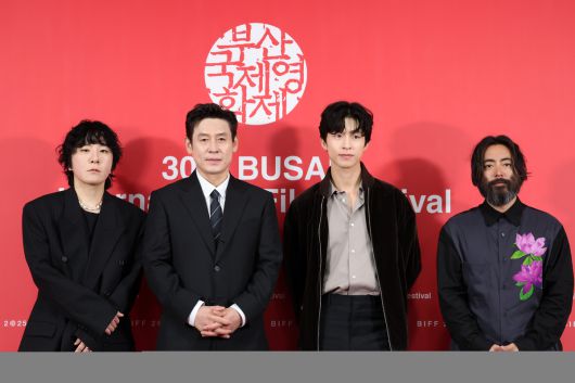 19일 부산 해운대구 영화의전당에서 열린 영화 ‘굿뉴스’ 기자회견에서 감독 변성현(왼쪽부터), 배우 설경구, 홍경, 야마다 타카유키가 포즈를 취하고 있다. 뉴시스 |