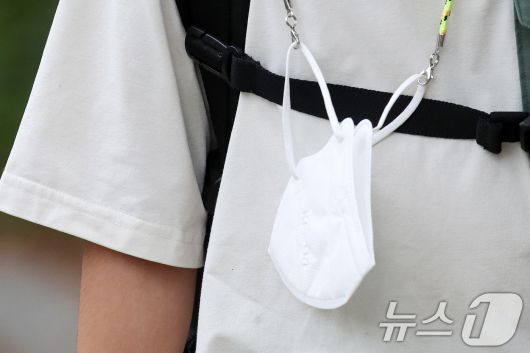 서울 시내의 한 초등학교 인근에서 한 학생이 마스크를 목에 걸고 등교하고 있다. /뉴스1 ⓒ News1 이승배 기자 |