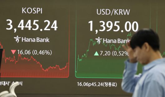 코스피 3,445선 하락 마감 19일 오후 서울 중구 하나은행 본점 딜링룸 현황판에 코스피가 표시돼 있다. 이날 코스피는 전장보다 16.06포인트(0.46%) 내린 3,445.24에 거래를 마감했다. 2025.9.19. 연합뉴스