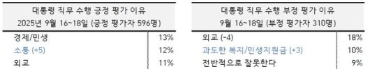 이 대통령의 국정 수행을 긍정 평가한 이유로는 '경제∙민생'이 13%로 가장 높았고, '소통'(12%), '외교', '전반적으로 잘 한다'(각 11%) 순이었습니다. 긍정 평가 이유 중 '외교'는 부정 평가의 이유로도 수위(18%)에 올랐고, '과도한 복지∙민생지원금'(10%), '전반적으로 잘 못한다'(9%)도 부정 평가의 이유로 조사됐습니다. 같은 정책과 같은 성과를 놓고도 이념과 진영에 따라 평가가 극명하게 엇갈리는 것으로 보입니다.