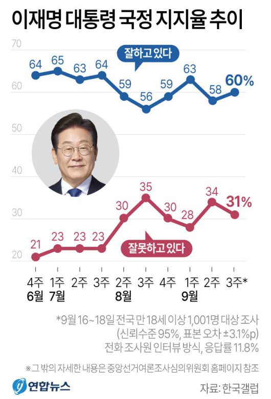 이 대통령 국정운영 지지율 60%...전주 대비 2%p 상승