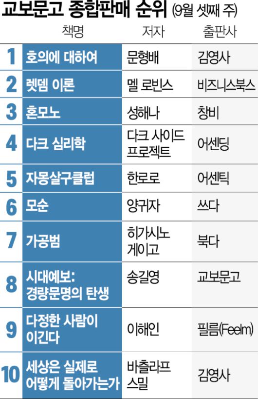 문형배 전 헌법재판관의 에세이 ‘호의에 대하여’가 3주 연속 종합 1위에 오르며 인기를 이어가고 있다. 최근 이어지는 사법 개혁 논란이 책에 대한 관심도를 꾸준히 높이는 요인으로 풀이된다. 멜 로빈스의 ‘렛뎀 이론’은 2위를 지켰다. 이 책은 자기계발을 위한 동기 부여와 마음가짐을 담아 특히 30대 여성 독자의 높은 지지를 얻었다.