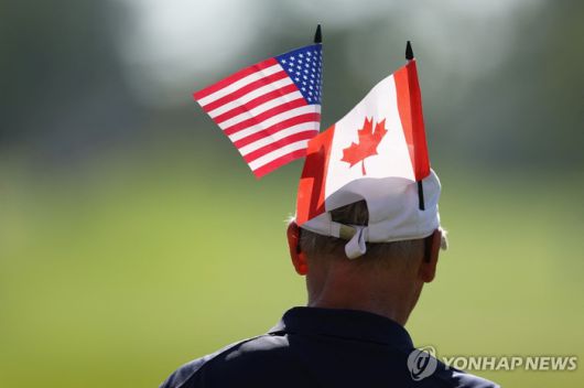 미국과 캐나다 국기를 동시에 달고 있는 한 남성 [사진 = 연합뉴스] |