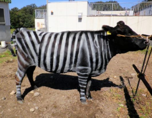 일본 연구팀이 흑우에 수용성 래커로 흰색 줄무늬를 칠해 얼룩말 무늬를 만든 결과, 이 소들은 검은 줄무늬를 칠한 소나 아무 칠도 하지 않은 소보다 파리에 물리는 횟수가 최대 50% 적었다.