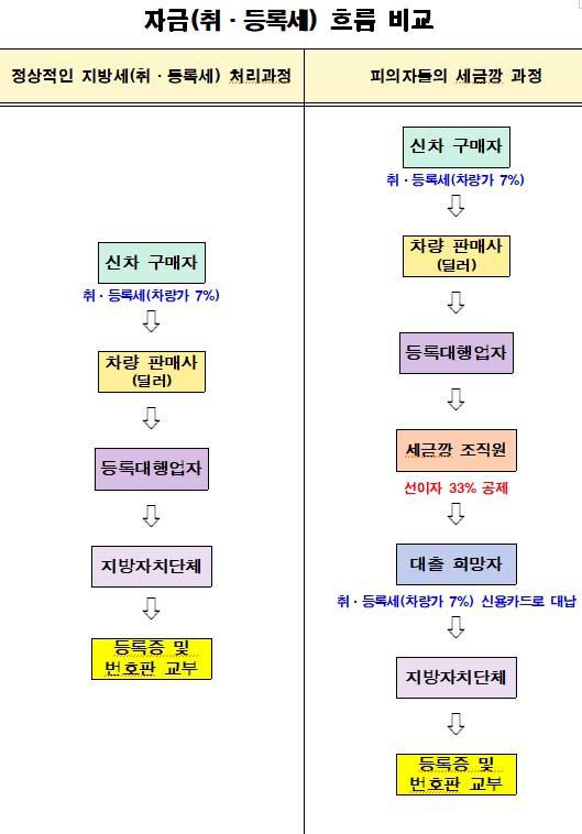 [무안=뉴시스] 변재훈 기자 = 전남경찰청 반부패·경제범죄수사2대는 여신전문금융업법 위반 혐의를 받는 '세금깡' 일당 20명을 검거, 2명을 구속했다고 19일 밝혔다. 차량 취등록세 납부 과정과 세금깡 과정. (사진=전남경찰청 제공) 2025.09.19. photo@newsis.com *재판매 및 DB 금지 |