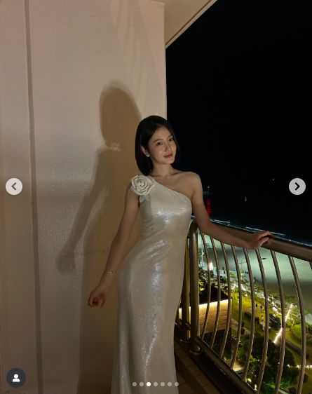 사진 속 신예은은 한쪽 어깨를 드러낸 드레스를 입고서 난간에 기대어 포즈를 취하고 있다. 어두운 밤하늘 속 은은한 불빛 아래 미소를 짓고 있는 그는 사랑스러운 분위기를 자아낸 모습.