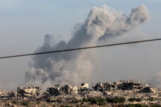 19일(현지시간) 이스라엘이 팔레스타인 영토를 폭격하는 동안 피어오른 연기가 가자지구 국경 지대에서 보이고 있다. AFP연합뉴스 |