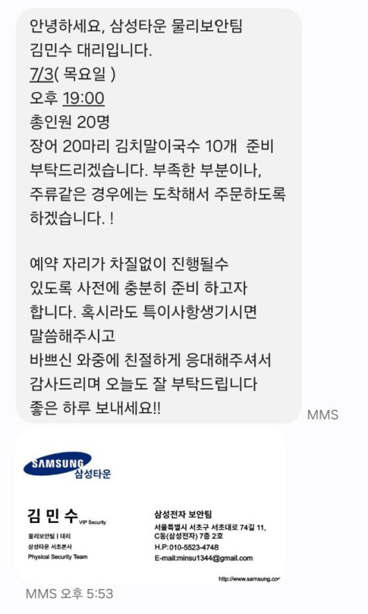 “삼성타운 보안팀 김민수 대리입니다. 이재용 회장님이 회식에 참석하니 와인을 준비해 주세요.”