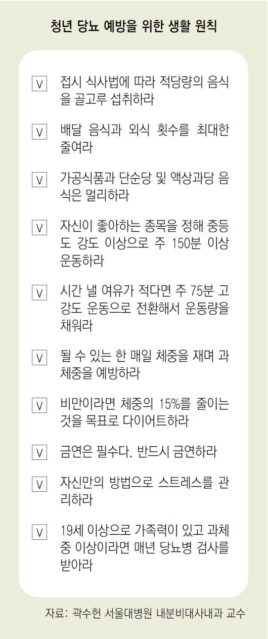청년 당뇨의 절반 가까이는 체중 증가에서 병이 비롯된다. 따라서 과체중을 방지하는 게 최선이다. 곽 교수는 이를 위해 ‘접시 식사법’을 제안했다. 식사할 때 접시 한 그릇에 모든 음식을 놓은 방법이다. 접시의 절반은 푸른 채소로 채운다. 4분의 1은 곡물류인데, 기왕이면 쌀밥보다는 현미와 같은 잡곡이 낫다. 나머지 4분의 1에는 단백질과 지방 음식을 놓는다. 곽 교수는 “이런 식사법을 통해 열량을 줄이고, 영양소를 균형 있게 섭취할 수 있다”라고 말했다.