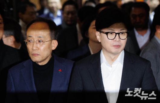 "원내 대표가 당사로 모이라는 공지를 했기 때문에 혼란스러워하는 의원들에게 명확한 기준이 될 수 있도록 우 의원에게 '당 대표 지시'라는 표현을 써달라고 했다" 한 전 대표는 계엄 해제 표결 직전 국민의힘 의원들에게 '당대표 지시'를 강조하며 본회의장 소집을 알렸다고 기록했다. 당시 본회의장에는 국민의힘 의원 10여 명만이 들어와 있었다고 한다. 그는 4일 0시 6분경 우재준 의원을 통해 '대표님 지시사항입니다. 본회의장으로 와주세요. 방금 옆에서 직접 보고 지시하셨습니다'란 지시를 남겼다. 특검은 추 전 원내대표가 윤석열 전 대통령의 전화를 받고, 의원 총회 장소를 거듭 변경한 점에 수사력을 집중하고 있다. 추 전 원내대표가 '국회→당사→국회 예결위 회의실→당사'로 지시를 바꾸면서, 한 전 대표가 의원들을 본회의장으로 소집하는 당대표로서의 지휘 업무를 제대로 수행하지 못했다고 판단하는 것이다.지난해 12월 4일 오전 국민의힘 당시 한동훈 대표, 추경호 원내대표가 국회에서 열린 비상 의원총회를 마치고 나서고 있다. 황진환 기자 |