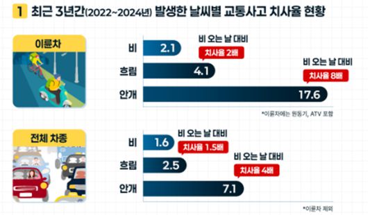 19일 한국도로교통공단에 따르면 2022년부터 지난해까지 최근 3년간 기상상태별 이륜차(원동기, 사륜 오토바이 포함) 사고를 분석한 결과 안개 낀 날의 사고 치사율은 17.6으로 전체 평균(2.5)을 크게 웃돌았다. 치사율은 교통사고 100건 당 사망자 수를 집계한 수치다. 흐린 날에도 이륜차 사고 치사율이 4.1로 평균을 상회했다. 다만 비가 오는 날(2.1)과 맑은 날(2.4)은 평균보다 치사율이 낮았다. 비가 오는 날 보다 안개 낀 날의 치사율이 8배 높다는 분석이다.