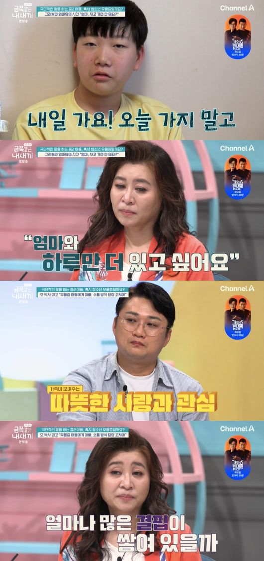한편, 금쪽이는 아빠와 함께 타지에서 지내고 있는 엄마를 재회했다. 모처럼 재회에 금쪽이는 웃었고, 엄마는 금쪽이의 극단적 행동에 대해 “진짜 그러고 싶었던 거냐. 금쪽이가 네가 진짜 그때 그랬으면”이라며 울컥했다.