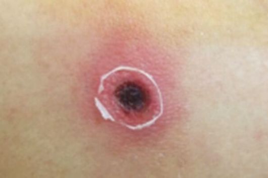쯔쯔가무시균을 보유한 털진드기 유충에 물린 자리에 생긴 검은 딱지(가피). 질병관리청 제공 |