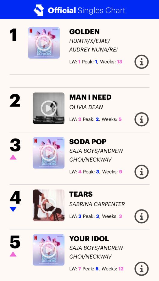 영국 오피셜 차트는 20일(한국시간) 싱글 차트 '톱 100' 순위를 공개했다. '케데헌' OST '골든'(GOLDEN)이 1위에 올랐다.