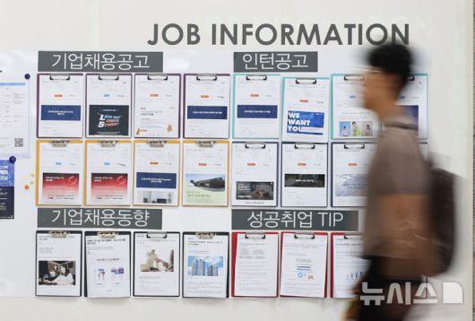 [서울=뉴시스] 황준선 기자 = 서울 시내 한 대학일자리플러스센터 채용 공고 게시판 앞으로 학생들이 이동하고 있다. 2025.08.18. hwang@newsis.com |