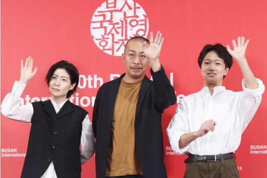 20일 부산 해운대구 영화의전당에서 열린 제30회 부산국제영화제 경쟁 부문 '여행과 나날' 기자회견에서 감독과 배우들이 포즈를 취하고 있다. 왼쪽부터 심은경, 미야케 쇼, 타카다 만사쿠. 연합뉴스 |