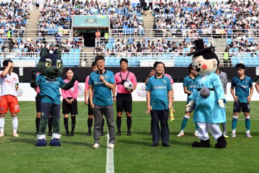 이민근 안산시장(앞줄 왼쪽 두번째)이 안산와~스타디움에서 진행된 '뭉쳐야 찬다4' 첫 직관 경기에서 인사 발언을 하고 있다. [사진=안산시] |