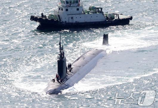 미국 해군 버지니아급 핵잠수함 '버몬트함'(SSN-792·7800톤)이 지난해 9월 23일 오전 부산 남구 해군작전사령부 부산작전기지에 입항하고 있다. 2024.9.23/뉴스1 ⓒ News1 윤일지 기자 |