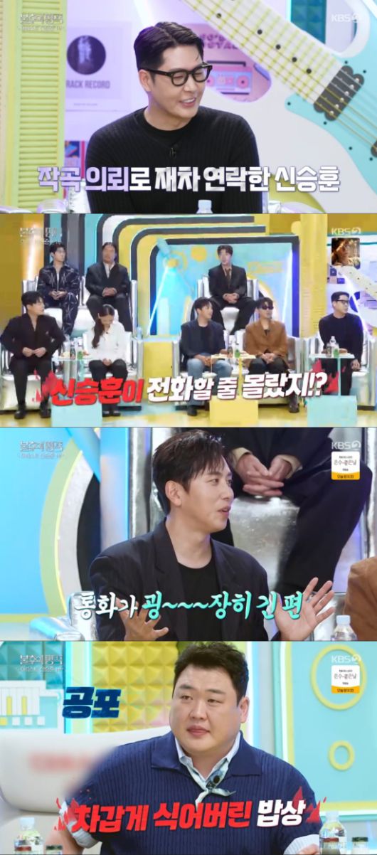 '불후의 명곡' 녹화를 앞둔 신승훈의 반응도 전했다. 정준일은 "어제 그제 전화를 받았다. '너무 훌륭한 후배들이 내가 한다니까 다 나온다'고 했다면서 굉장히 흥분하고 격앙돼 있으시다"고 말해 폭소를 자아냈다.