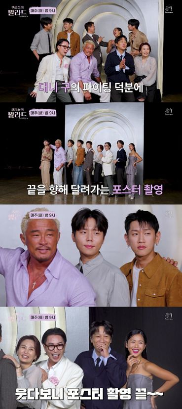 ‘우리들의 발라드’ 150인의 '탑백귀'(톱100에 오를 노래를 가려내는 귀)를 대표하는 정재형, 차태현, 추성훈, 전현무, 박경림, 대니 구, 크러쉬, 정승환, 오마이걸 미미가 참여한 이번 포스터 촬영은 단체 컷, 개인 컷 순으로 진행됐다. 먼저 단체 포스터 촬영이 시작되자 ‘탑백귀’ 구성원들은 웃음꽃이 활짝 핀 밝은 표정, 자연스러운 무드 등 현장 스태프들의 디렉팅에 맞춰 능숙하게 촬영을 진행했다.