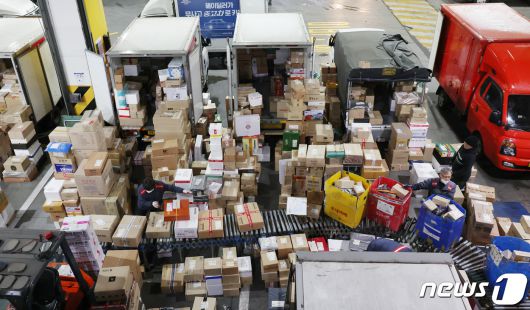지난해 2월 서울 송파구 서울복합물류단지에서 작업자가 택배 분류 작업과 상차 작업을 하고 있다. (사진은 기사와 관련 없음). 2024.2.6/뉴스1 ⓒ News1 김민지 기자 |