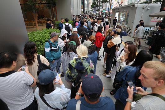 매장이 문을 열기 전이지만 150여명의 사람이 이미 줄지어 서 있었다. 상당수 사람 손에는 아이폰이 들려있었고, 귀에는 애플의 무선 이어폰인 에어팟이 꽂혀 있었다. 지난 19일 아침 7시30분 서울 명동 애플스토어 앞은 이른 시각에도 애플 충성 고객으로 보이는 이들로 장사진을 이뤘다.
