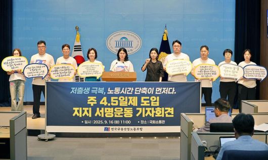 지난 16일 전국금융산업노동조합이 국회에서 주 4.5일제 도입 기자회견을 열고 있다. 금융노조 제공