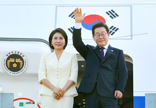 이재명 대통령과 김혜경 여사가 일본·미국 방문을 위해 지난 8월 23일 성남 서울공항을 출발하며 공군 1호기에 올라 인사하고 있다. [연합] |