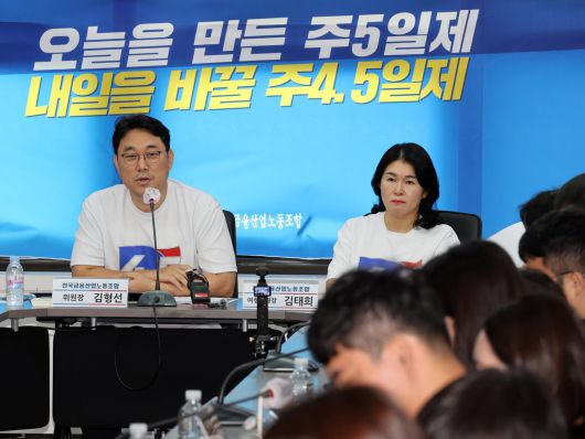 김형선 금융노조 위원장은 이달 16일 총파업 결의 대회 기자회견에서 “주 4.5일제는 단순히 노동시간을 줄이는 제도가 아니라 모든 노동자에게 재충전의 시간을 보장하고, 여성 노동자의 경력 단절을 막을 수 있다”며 “반드시 주 4.5일제를 쟁취할 것”이라고 말했다.