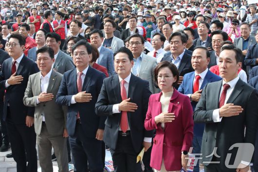 장동혁 대표와 송언석 원내대표를 비롯한 국민의힘 관계자들이 21일 오후 대구 동구 동대구역 광장에서 열린 야당탄압·독재정치 국민 규탄대회에 참석해 국민의례를 하고 있다. 2025.9.21/뉴스1 ⓒ News1 공정식 기자 |