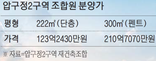 압구정 2구역 조합 역시 이 같은 가격 추이를 반영해 펜트하우스의 평당 분양가를 더 높게 책정했다. 전용 84~204㎡의 조합원 3.3㎡당 분양가는 8000만원대 중반인데 전용 222㎡ 준펜트하우스는 이 가격의 1.5배, 전용 300㎡ 펜트하우스는 2배 수준으로 책정됐다.