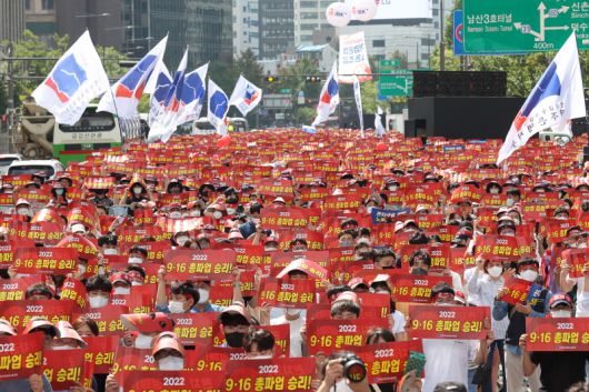 전국금융산업노동조합 조합원들이 2022년 9월 16일 서울 중구 코리아나호텔 앞에서 총파업 대회를 열고 구호를 외치고 있는 모습. 연합뉴스 |