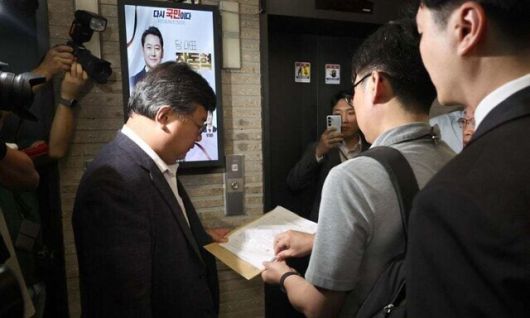 지난 18일 서울 여의도 국민의힘 중앙당사 현관 엘리베이터 앞에서 김건희 특검팀이 제시한 압수수색 영장을 국민의힘쪽 변호사가 읽고 있다. 윤운식 선임기자 yws@hani.co.kr |