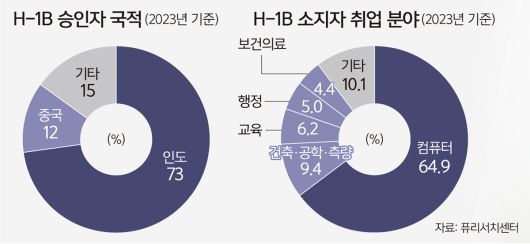 19일(현지시간) 로이터통신에 따르면 2023년 기준 H-1B 소지자의 64.9%가 컴퓨터 등 IT 업종에 취업해 있다. 당장 미국 IT 업계는 외국인 근로자 한 명을 고용할 경우 10만달러라는 거금을 추가로 부담해야 해 큰 충격에 빠졌다.